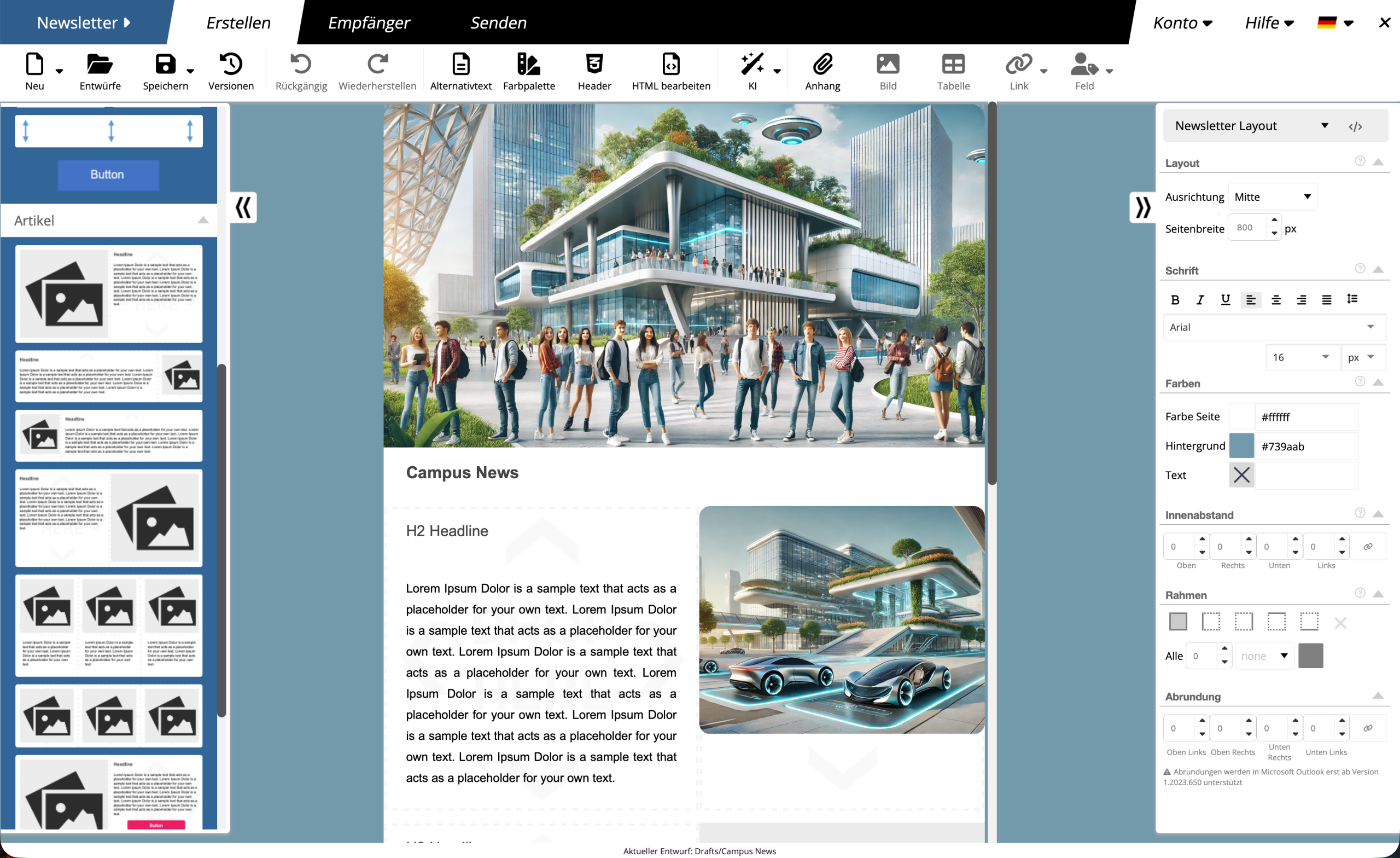 Ob einzelne Absätze oder ganze Newsletter: Die KI hilft beim Schreiben, Übersetzen und Bebildern – schnell, inspirierend und datenschutzkonform. Personenbezogene Daten werden dabei nicht übertragen.