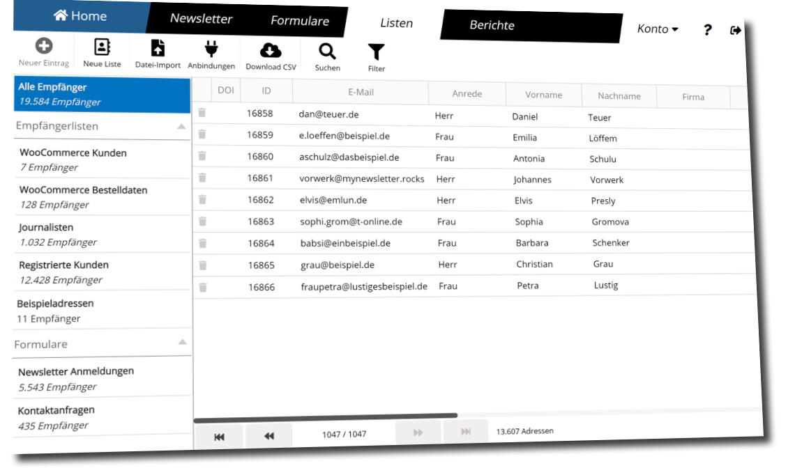 Verwalten Sie beliebig viele Adresslisten für Ihre Newsletter. Sämtliche Daten können direkt mit unserem Editor bearbeitet werden.